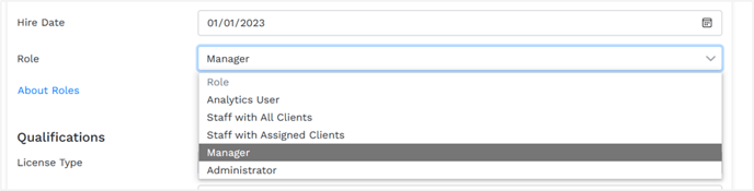 Manager – Managers are able to add/edit Staff, view/edit client records assigned to staff assigned to them, add/edit Services, add/edit Programs, and view the Outcomes Dashboard and Analytics for their own clients and the clients of staff assigned to them.