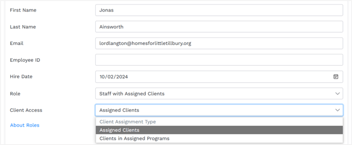 - Click the dropdown menu next to Client Access to select Assigned Clients or Clients in Assigned Programs: